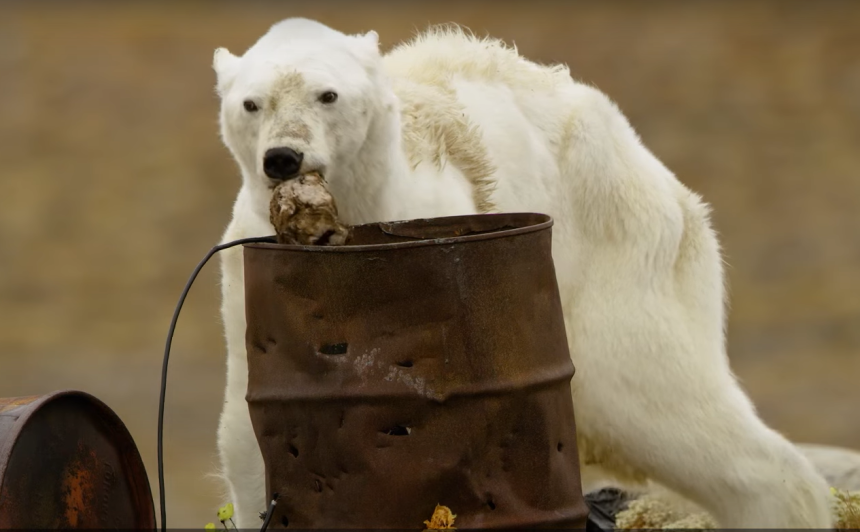 | 한 북극곰이 앙상한 모습으로 민가 쓰레기통을 뒤지고 있다.[유튜브 내셔널지오그래픽 채널 갈무리] |