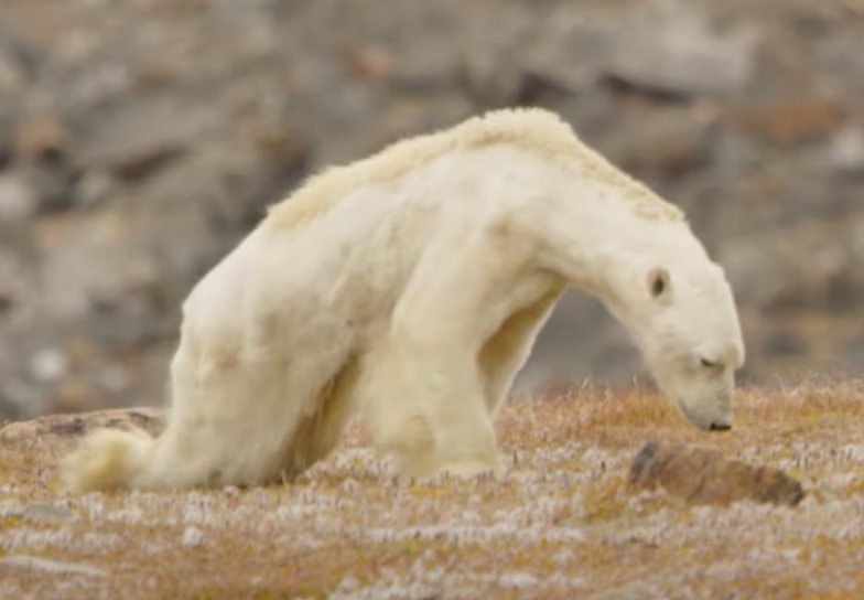 | 한 북극곰이 앙상한 모습으로 먹이를 찾고 있다.[유튜브 내셔널지오그래픽 채널 갈무리] |
