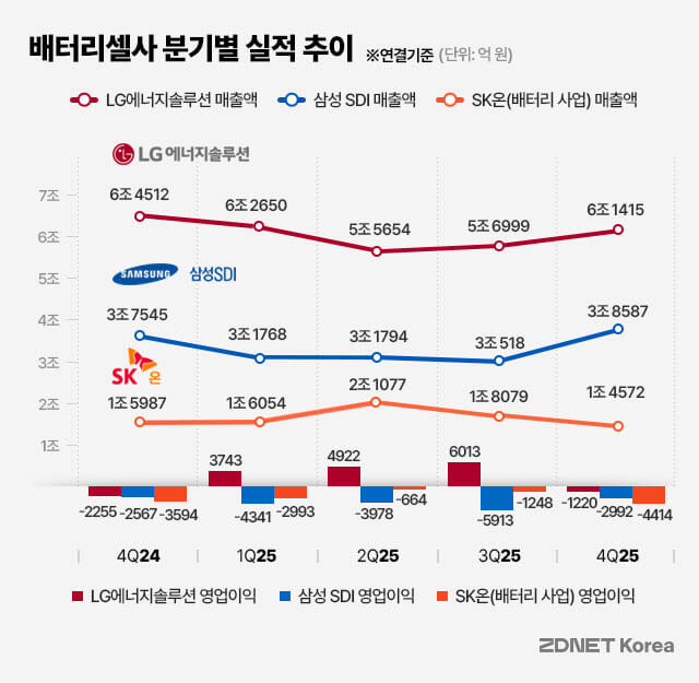 작년 4분기 실적을 보면 ▲LG에너지솔루션 매출 6조 1,415억원, 영업손실 1,220억원 ▲삼성SDI 매출 3조 8,587억원, 영업손실 2,992억원 ▲SK온(배터리 사업) 매출 1조 4,572억원, 영업손실 4,414억원을 기록했다.